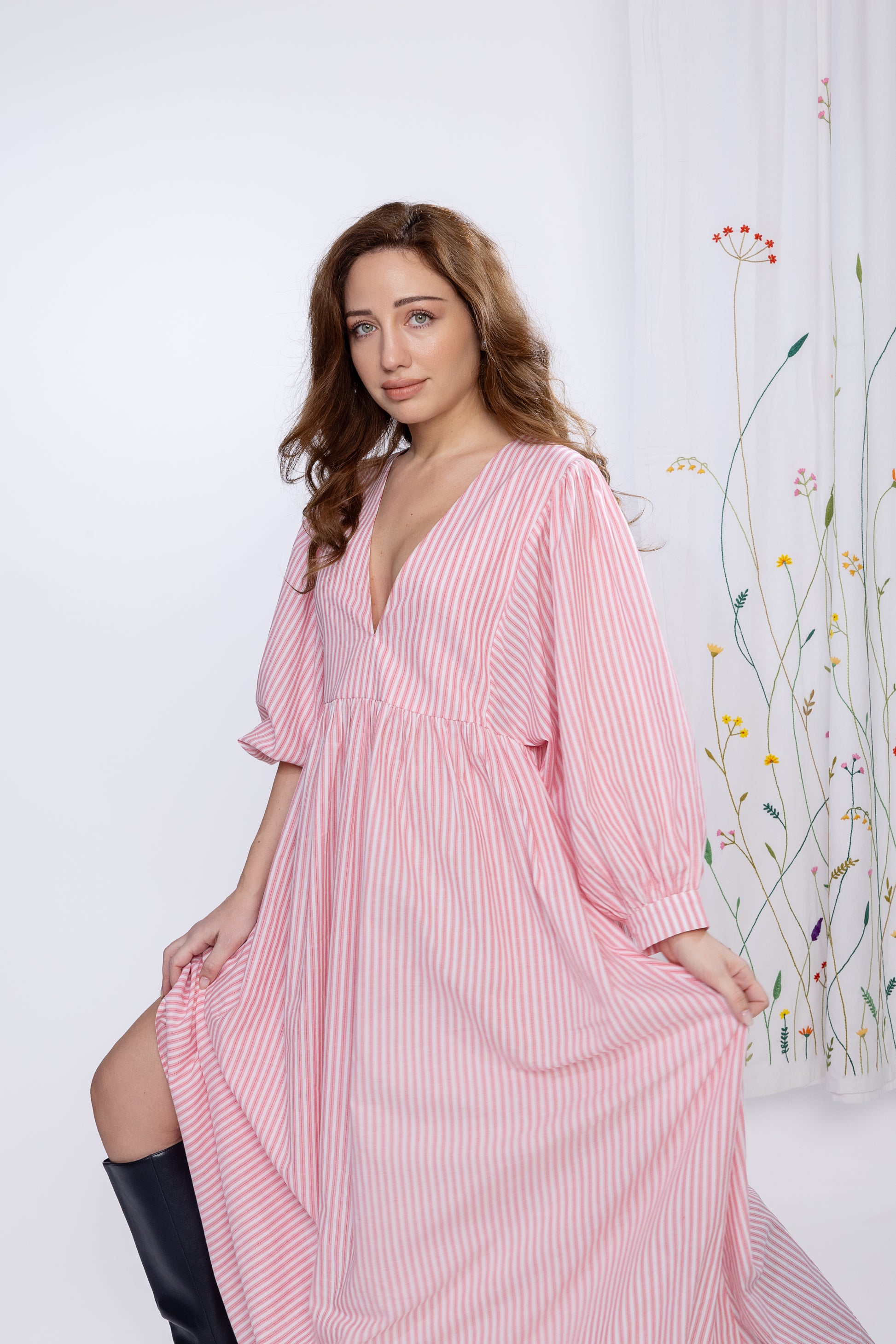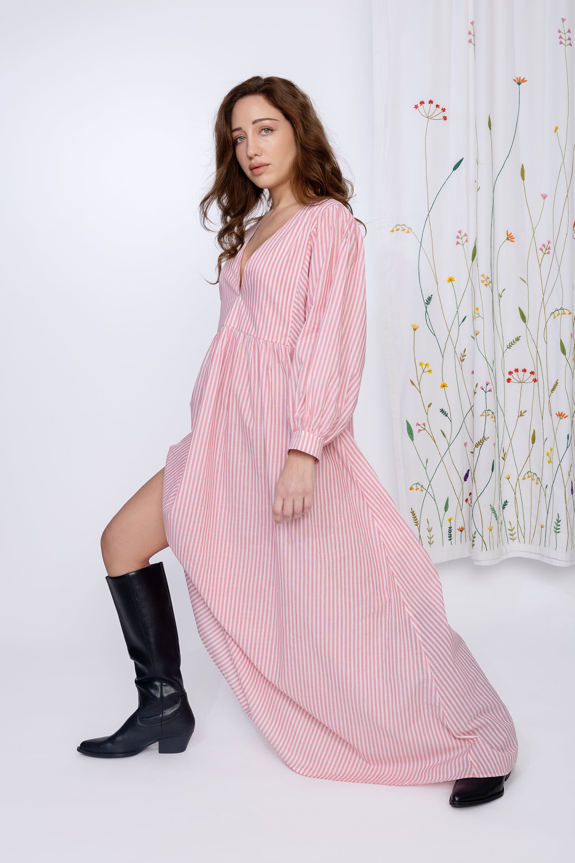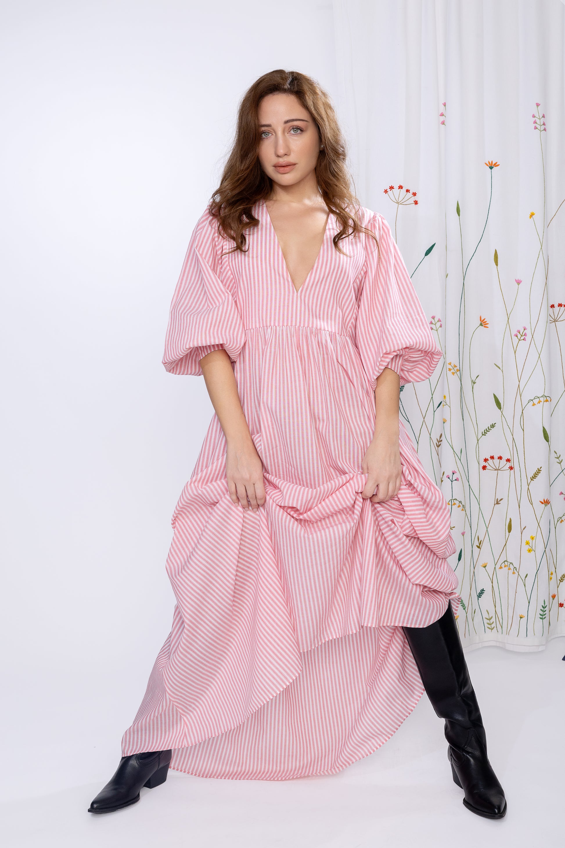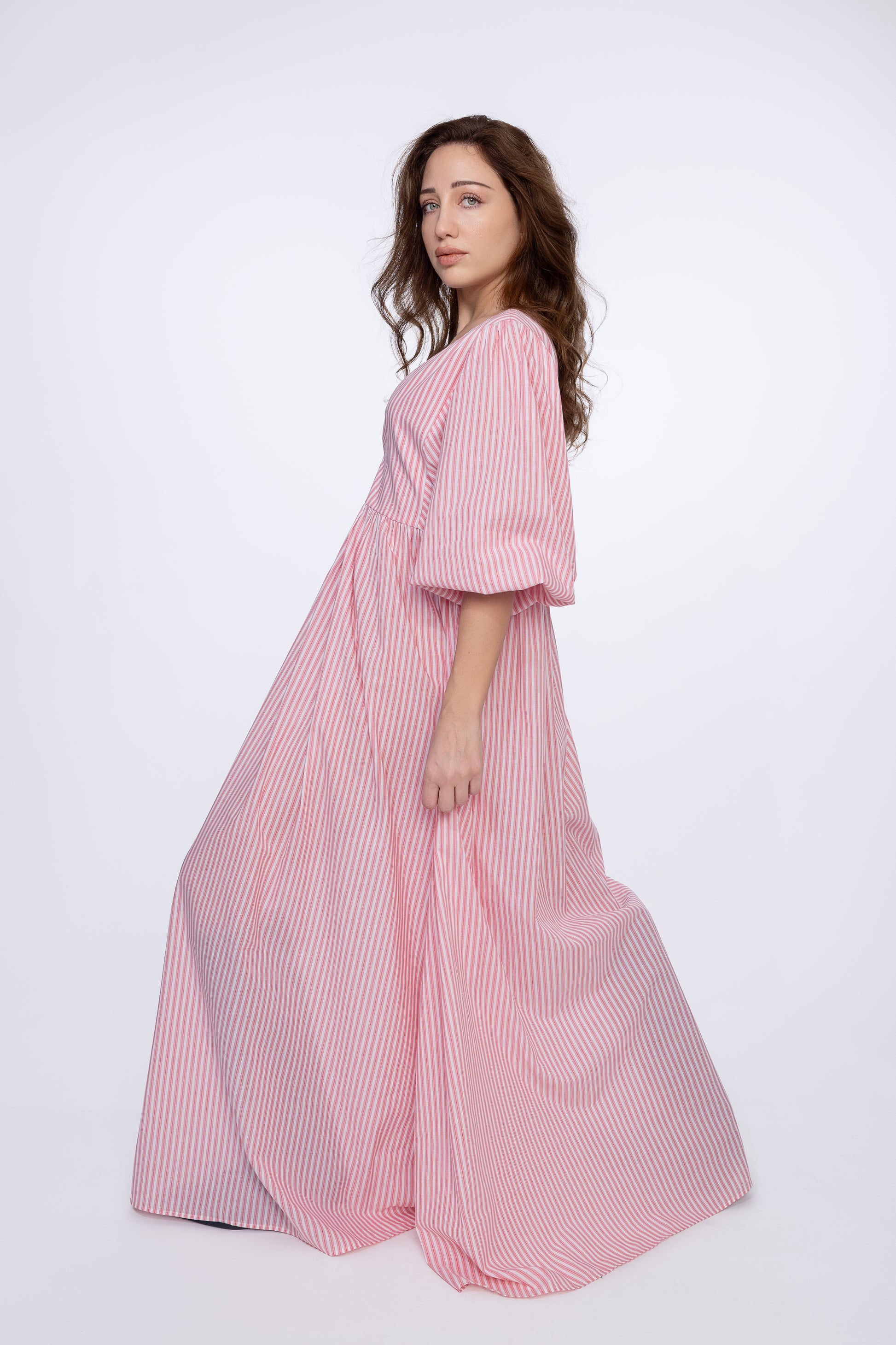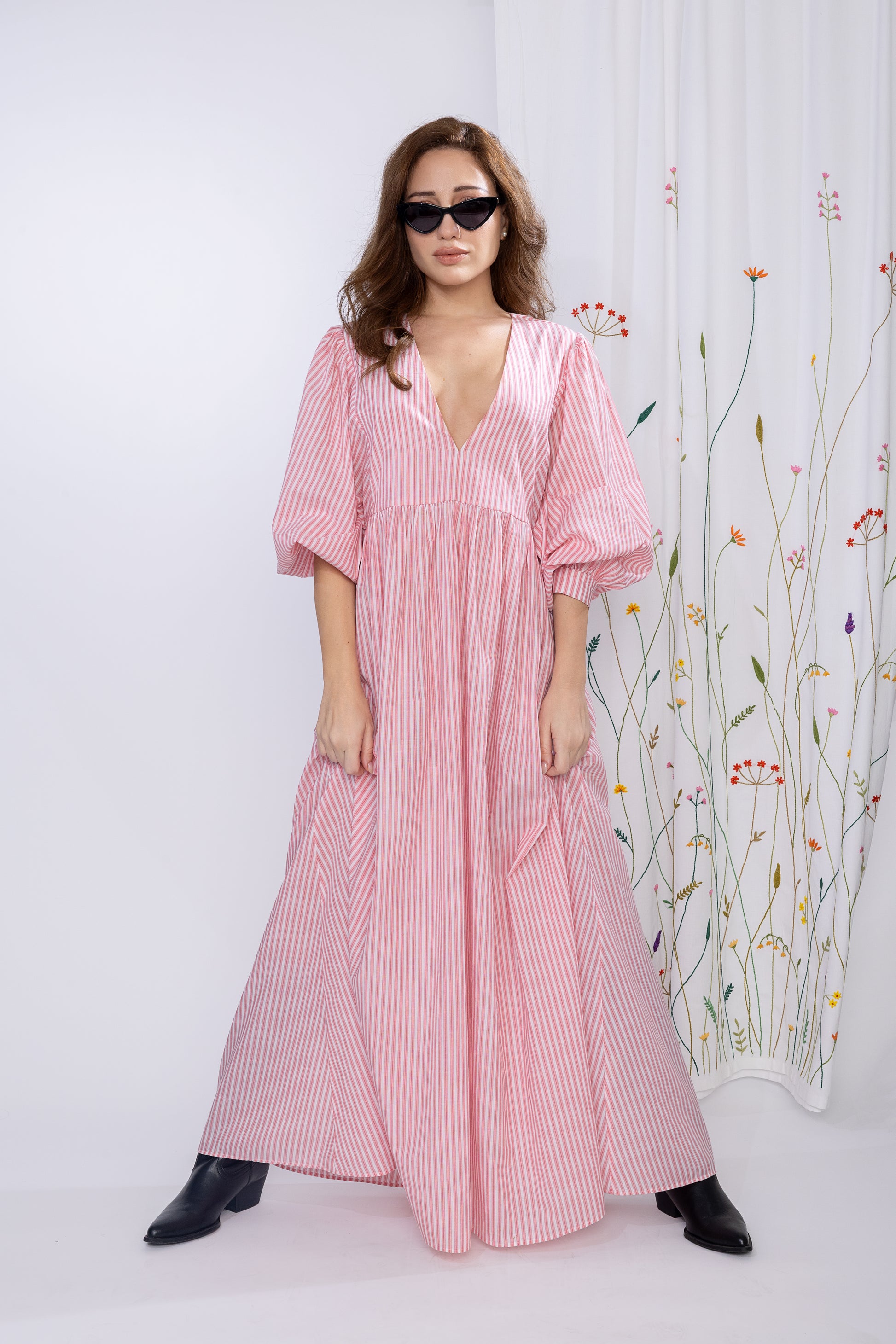 Float through the day in Picnic Whispers — a dreamy pink striped maxi that feels like sunshine and soft laughter wrapped in fabric. With its billowy sleeves and breezy silhouette, this dress is made for long walks, lemonade sips, and spontaneous dance moves. Whether you're chasing clouds or just the perfect brunch spot, this one's your Sunday soulmate.
