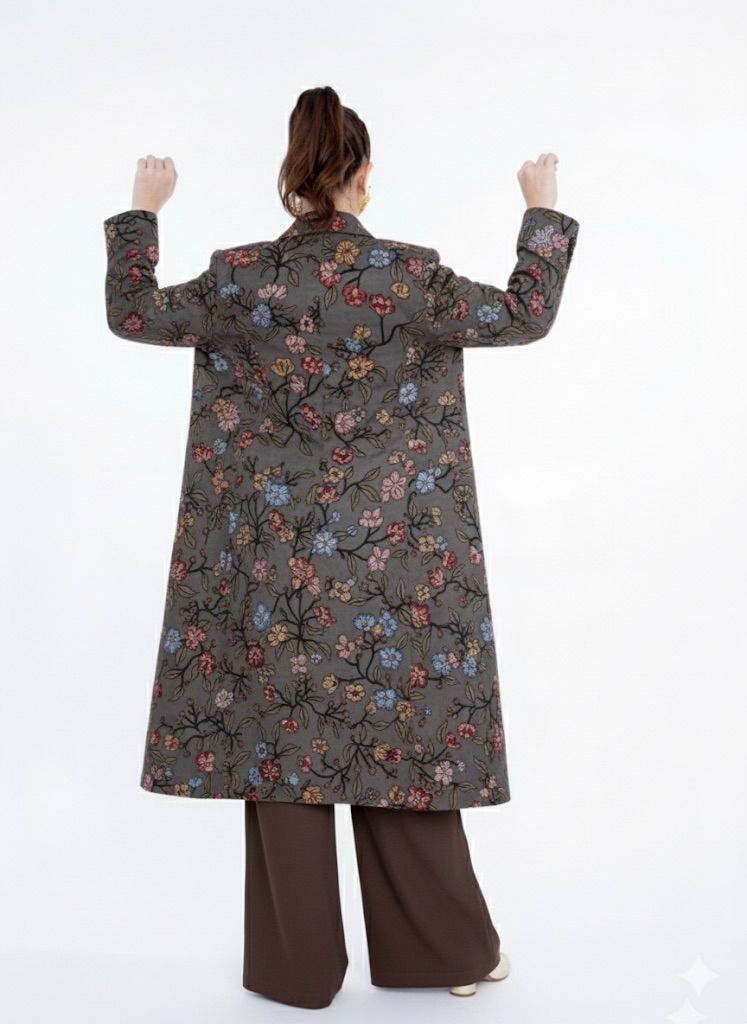 This stunning long jacket is an artistic statement piece, blending heritage techniques with a contemporary silhouette. Crafted from high-quality cotton, it features a captivating array of hand-painted floral motifs in warm, earthy tones, achieved through a natural dyeing process. The vibrant blooms and intricate patterns create a feeling of effortless elegance.